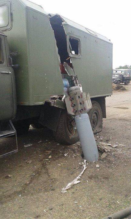Во время обстрела войсками РФ позиций украинских воинов под Дмитровкой 220 мм ракета российского "Урагана" пробила украинскую штабную машину и не взорвалась. Об этом сообщают пользователи соцсети Facebook.