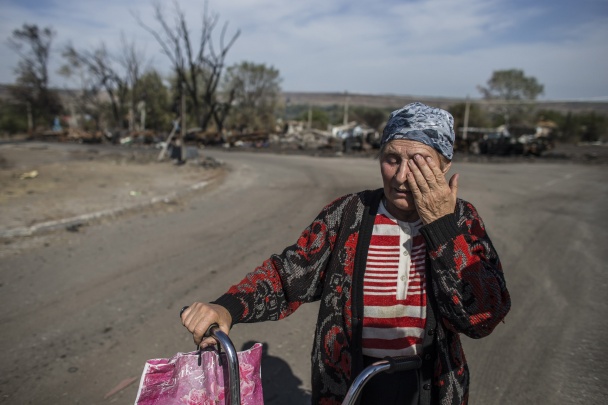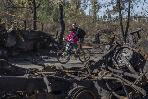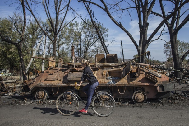 В Лутугино, что под Луганском, куда только недавно привезли продукты, местные жители без эмоций едут на велосипедах и проходят мимо сгоревших украинских БРТов, которые были уничтожены российскими военными и боевиками.