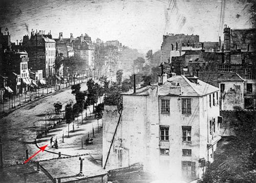 Первой фотографией человека считается «Бульвар дю Тампль» — снимок, сделанный Луи Дагером в конце 1838 года. В левом нижнем углу можно различить фигурку человека, которому чистят ботинки. Он оставался неподвижным достаточно долго, чтобы попасть на фотопластинку. Экспозиция была не менее 10 минут, поэтому улица кажется пустынной.