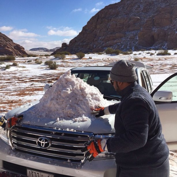 На северо-западе Саудовской Аравии в провинции Табук выпал снег. Непривыкшие к таким погодным условиям саудиты обрадовались зимним осадкам и стали публиковать в соцсетях фотографии. Жители теплой страны весело играют в снежки и делятся пейзажами. Красоты Саудовской Аравии под слоем снега приобретают на фотографиях потрясающий вид.