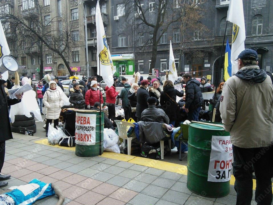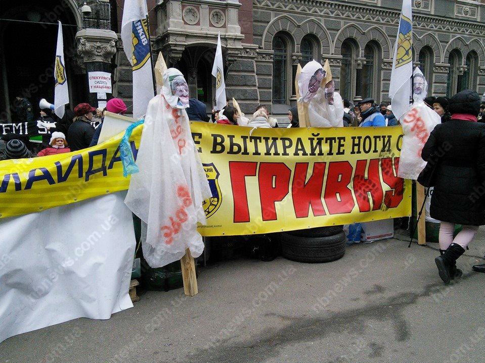 В руках у митингующих плакаты: «Пока Лера у казны, нет покоя для страны» с изображением главы НБУ госпожи Гонтаревой, а также «Гонтарева, прекрати гнобить украинцев, либо уходи прочь».