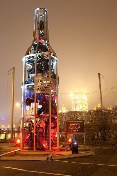 В Москве появился памятник пьянству за рулем - гигантская бутылка высотой 12 метров, наполненная разбитыми автомобилями.