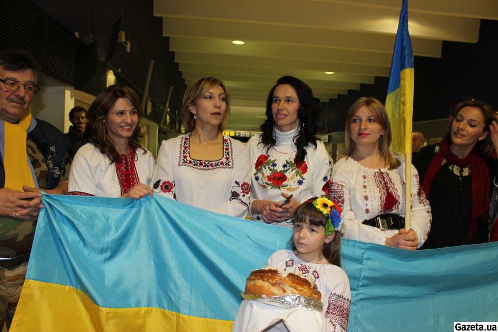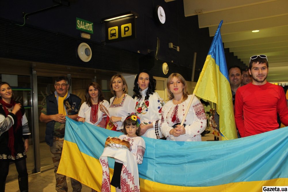 Национальную сборную Украины в Севилье ждал очень теплый прием от украинской диаспоры. После прилета и прохождения паспортного контроля наших игроков на испанской земле приветствовали земляки в вышиванках, с флагами Украины и караваем.