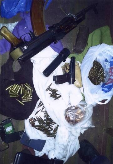Изъято: 3 кг пластида, 5 шашек аммонита с запалами, 2 автомата Калашникова, глушитель, граната «РГД-5», 312 патронов, сигнальная мина, а также ноутбук и сервер.