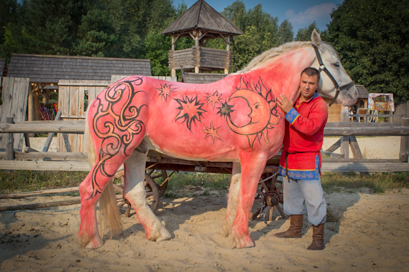 Кроме людей, в этот день художники также разрисовали огромного белого коня Ратибора першеронской породы из Княжеской конюшни Древнего Киева.