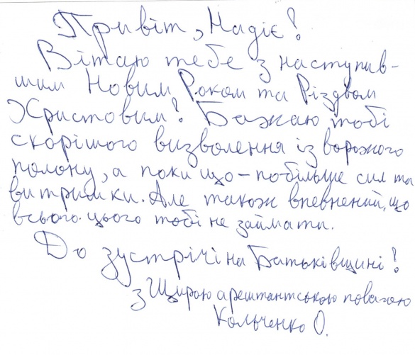 Как сообщает ТСН, письма незаконно осужденным украинцам передали украинский консул в Ростове-на-Дону Александр Ковтун и генеральный консул Виталий Москаленко. И Сенцов, и Кольченко ответили Наде и она с помощью консулов уже получила их ответы. На поздравлении от президента Сенцов написал: «Слава Украине!». Кольченко пожелал Савченко скорейшего освобождения из вражеского плена, а пока — выдержки.