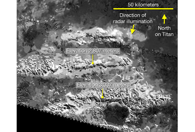 Самой высокой точкой Титана является гора Митрим. В высоту она достигает 3337 метров и расположена в центре нижнего хребта (показано на рисунке). Выше и севернее ее располагается другая гора высотой 2807 метров, сообщает Lenta.ru.