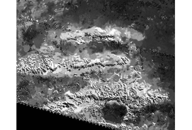 Первый столбец представляет собой снимок в инфракрасном диапазоне с длиной волны два микрометра. Второй столбец изображений смонтирован совмещением двух снимков, полученных на различных длинах волн. Третий представляет собой композицию из снимков, полученных с тремя светофильтрами: красном (пять микрон), зеленом (два микрона) и синим (1,27 микрона). Крайний правый столбец получен монтированием с использование перечисленных трех цветов и наведением резкости. Это позволяет рассмотреть на поверхности Титана различные особенности рельефа.