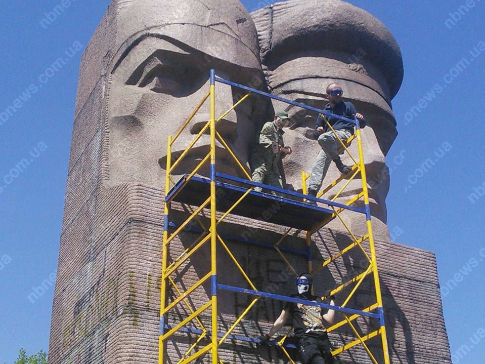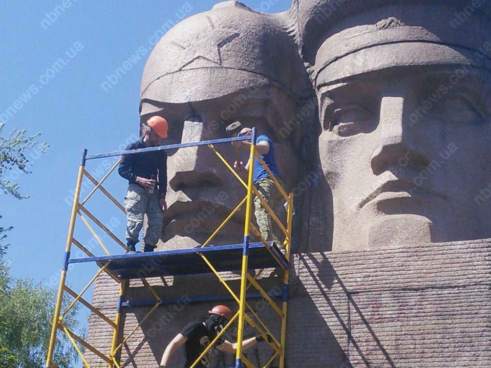 Представители добровольческих батальонов ОУН и ДУК «Правый сектор», полка «Азов», а также гражданского корпуса «Азов» установили леса и пытаются кувалдой отбить губы и нос на одном из лиц чекистов, сообщает НБН.