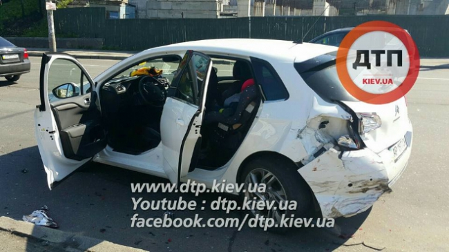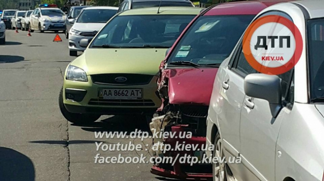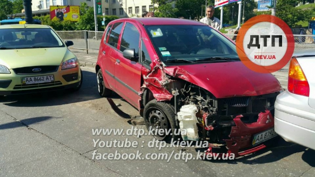 По предварительным данным «Мицубиши Кольт» получил удар в багажник: от удара полетел вперед и зацепил еще 3 авто, после чего последовала цепная реакция, сообщает Dtp.kiev.ua.