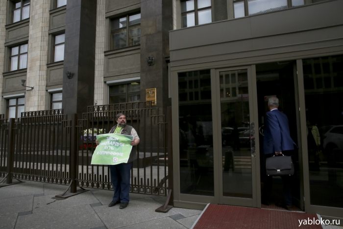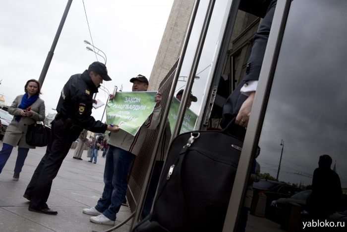 Сегодня, 18 мая, активисты московского отделения российской партии «Яблоко» провели одиночные пикеты у Госдумы против законопроекта о Нацгвардии. Как стало известно «Фразе», участники акции по очереди сменяли друг друга с плакатом «Закон о Нацгвардии - путь к опричнине».