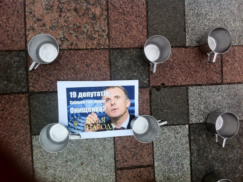 Активисты Центра противодействия коррупции проводят акцию перед зданием парламента, требуя снятия неприкосновенности и ареста депутата от группы "Воля народа" Александра Онищенко. Как стало известно «Фразе», об этом на своей странице в Twitter сообщает движение «Чесно».