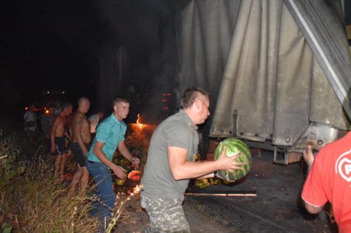 «На помощь пришли другие водители, которые останавливались и присоединялись к работе, потому что фуру пришлось тушить... арбузами, которые были под тентом, ведь огнетушители быстро кончились», — написал председатель Херсонской обладминистрации.