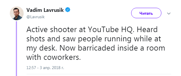 «Активная стрельба в штаб-квартире YouTube. Я с моего рабочего стола слышал выстрелы и видел, как бегут люди. Забаррикадировался с комнате с коллегами», — написал в подтвержденном аккаунте Twitter сотрудник компании Вадим Лаврусик (@Lavrusik).