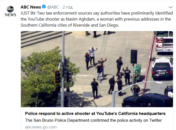 «Два источника в правоохранительных органах заявили, что предварительно установлена личность стрелявшей в офисе Youtube — это женщина Насим Агхдам, ранее проживавшая в Южной Калифорнии в городах Риверсайд и Сан-Диего», — передает телеканал ABC в Twitter.