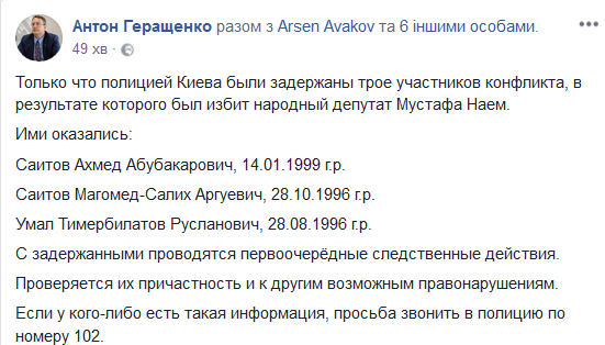 Советник главы МВД Антон Геращенко заявил, что столичная полиция задержала троих участников конфликта. Ими оказались Саитов Ахмед Абубакарович, 14.01.1999 г.р. Саитов Магомед-Салих Аргуевич, 28.10.1996 г.р. и Умал Тимербилатов Русланович, 28.08.1996 г.р. Сейчас проверяется их возможная причастность к другим правонарушениям.