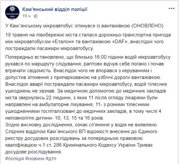 уточнили, что автокатастрофа произошла из-за потери сознания водителем маршрутного автобуса. Открыто уголовное производство по ч. 1 ст. 286 УК «нарушение правил безопасности дорожного движения».