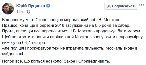 О задержании написал у себя в «Фейсбуке» генпрокурор Украины Юрий Луценко.