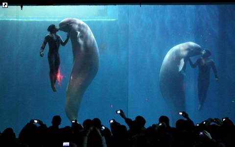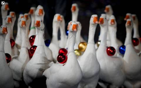 Гуси с елочными шариками на шеях во время парада трех волхвов «Cabalgata de Reyes» в Мадриде.