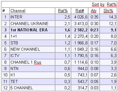 Как заявлял ранее генеральный директор Национальной телекомпании Украины Егор Бенкендорф, Первый Национальный по итогам 2010 года поднялся с 12-й позиции до 8-й среди основных украинских телеканалов. По последним рейтинговым исследованиям Первый Национальный постоянно улучшает показатели, что говорит о повышении внимания к каналу со стороны зрительской аудитории.
