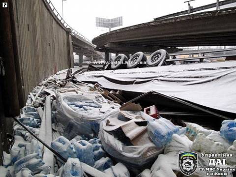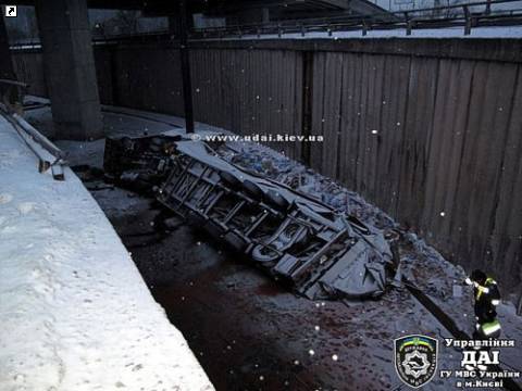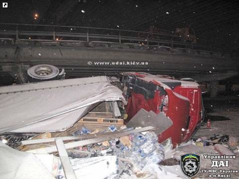 Во вторник, 22 февраля, утром в Киеве на Южном путепроводе, неподалеку от метро «Выдубичи», произошло ДТП, в результате которого грузовой автомобиль упал с 6-метровой высоты.
