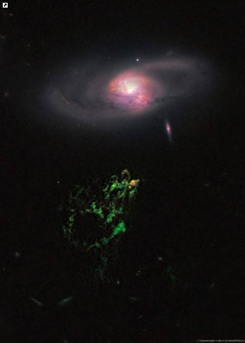 «Объект Ханни» – это единственная видимая часть газообразного облака длиной в 300 световых лет, растянувшегося вокруг спиральной галактики IC 2497. На фотографии видны скопления молодых звезд (желтого цвета).