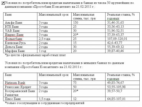 Количество банков, выдающих потребительские кредиты наличными, с начала 2011 года увеличилось на два учреждения – до восьми. При этом средняя ставка по таким займам значительно выросла. По данным компании Простобанк Консалтинг потребительские кредиты наличными (без карточки, без залога) на 21.02.2011 г. предлагают восемь банков из числа 50 крупнейших по размеру активов. С начала года на этот рынок вышли два новых учреждения (VAB Банк и Дельта Банк), пишет БизнесГид. Несмотря на увеличение предложения, средние ставки по кредитам наличными за последние два месяца значительно выросли. Так, средняя реальная ставка по таким займам для срока кредитования один год выросла на 9,97 процентных пункта – до 63,79% годовых; для срока два года – на 10,72 п.п., до 65,66% годовых. Лишь стоимость кредитов на три года почти не изменилась – рост на 0,6 п.п., до 45,8% реальных годовых.
