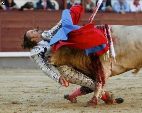 Эта фотография испанца Густаво Куэваса из агентства «EFE» заняла второе место в категории «Спорт». На фото - испанский матадор Хулио Апаричио, которого бык ранил в шею, и рог прошел через рот. Фото сделано во время корриды в Лас Вентас, Мадрид, 21 мая. (Gustavo Cuevas / EFE)