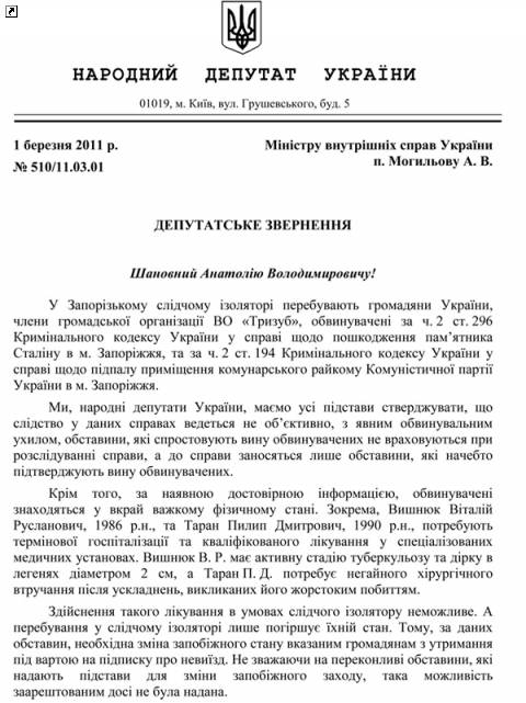 Народные депутаты передали совместное обращение, в котором требуют освобождения арестованных членов «Тризуба». Они настаивают на принятии необходимых мер для того, чтобы хотя бы больным политзаключенным была изменена мера пресечения.