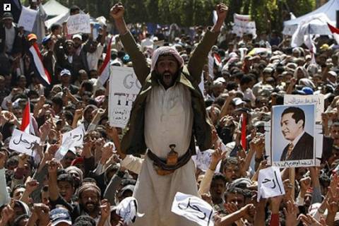 Йемен, Сана. Йеменские демонстранты выкрикивают лозунги, призывающие к свержению президента Али Абдаллы Салеха, во время многотысячного антиправительственного митинга в столице страны Сане.