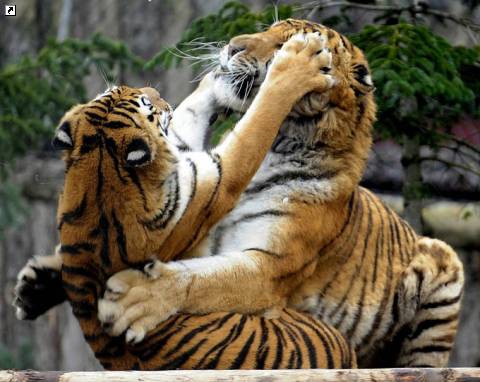 Сибирские тигры играют в Зоопарке д`Аменвилль во Франции.