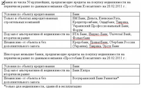 Уже пять банков из 16 кредитующих покупку недвижимости на первичном рынке готовы предоставлять займы независимо от объекта строительства. При этом ставки по ипотеке на покупку «первички» продолжают снижаться. По данным компании Простобанк Консалтинг кредиты на покупку недвижимости на первичном рынке на 28.02.2011 г. предоставляют 16 банков из числа 50 крупнейших по размеру активов. При этом уже пять учреждений – Кредобанк, ПриватБанк, Сбербанк России (Украина), банк «Таврика», Эрсте Банк – готовы кредитовать независимо от объекта строительства. В начале 2011 года таких банков было лишь три. Стоит отметить, что четыре банка (БТА Банк, Индэкс-Банк, Universal Bank, Фольксбанк) предлагают кредиты на «первичку» лишь под залог альтернативной недвижимости на вторичном рынке. Остальные кредитуют лишь покупку квартир в определенных объектах, пишет БизнесГид. Одновременно с улучшением условий выбора заемщиком недвижимости для покупки, стоимость займов снижается. За первые два месяца 2011 года больше всего подешевели кредиты на «первичку» со сроком погашения 15 лет – на 0,64 процентных пункта, до 18,13% реальных годовых. Средняя реальная ставка по займам сроком на 10 лет снизилась на 0,48 п.п., до 18,61% годовых.
