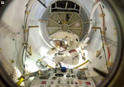 Подготовка к работе. Астронавт Дискавери Элвин Дрю готовится выйти в открытый космос. На фотографии - часть МКС, которая расположена снаружи корабля. 28 февраля.