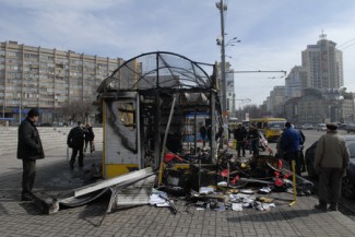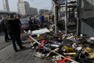 Одну из центральных площадей Киева затянуло дымом. Пожар уничтожил полностью торговый павильон. Фото