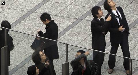 Фото — с сайта BBC. Сотрудники делового квартала Токио выбежали из на улицу и наблюдали, как под воздействием подземных толчков раскачиваются многоэтажные офисные здания.