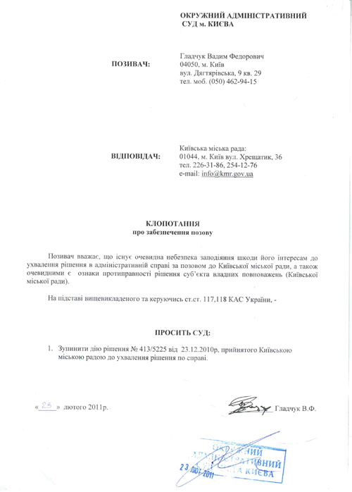 Также, одновременно с иском, было подано ходатайство от имени Вадима Гладчука о приостановлении действия решения № 413/5225 Киевского городского совета до принятия решения по этому делу. Предварительное судовое заседание, согласно решению Окружного административного суда города Киева, назначено на 5 апреля 2011 года в 8.00 (судья Добрянская).