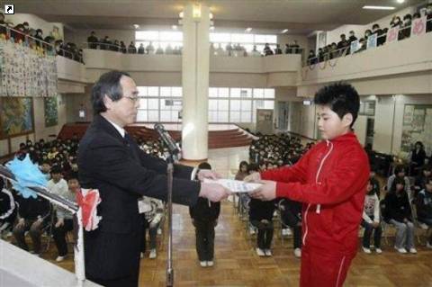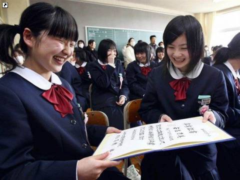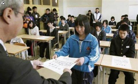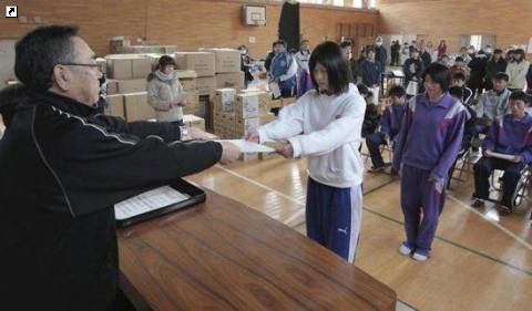 В разрушенных землетрясением и цунами японских городах закончился учебный год. Детям, которые сумели выжить в страшных природных катаклизмах, вручили аттестаты.