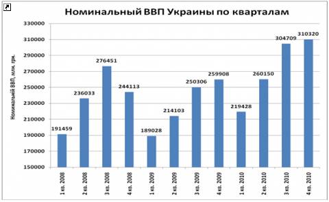 Номинальный ВВП в Украине в 2010 году достиг 1,0946 трлн. грн. (137,48 млрд. долларов США), что на 19,85% выше, чем в 2009 году. Темпы роста реального ВВП составили 4,2%.