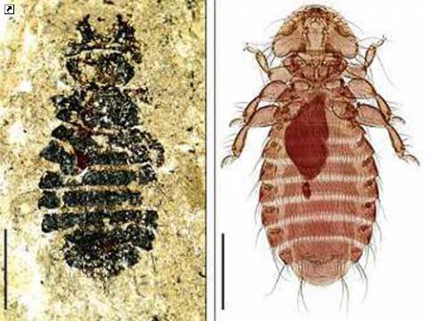 Современная вошь (справа) и ископаемая вошь возрастом 44 миллиона лет (слева)