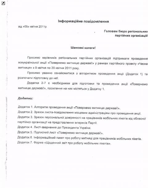 Итак, несколько цитат: «Просимо керівників регіональних партійних організацій підтримати проведення всеукраїнської акції «Повернемо митницю державі!» у рамках партійного проекту «Чесна митниця» з 9 квітня по 20 квітня 2011 року».
