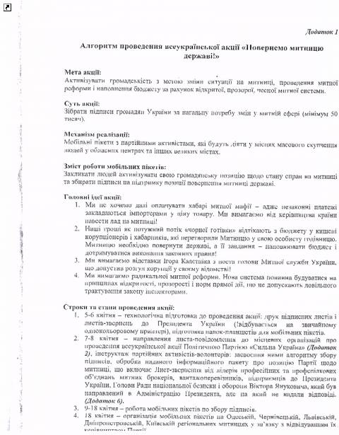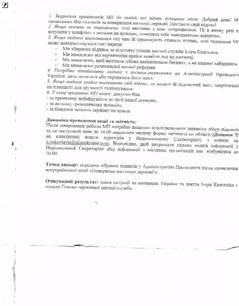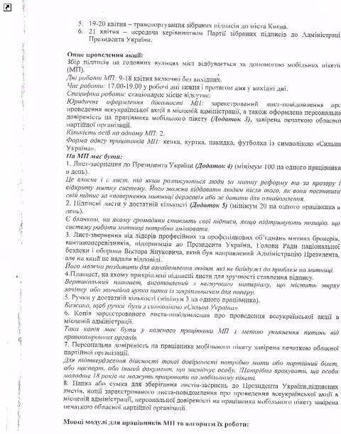 Рабочий распорядок и арсенал пикетчиков: «Дні роботи: 9-18 квітня включно без вихідних. Час роботи: 17.00-19.00 у робочі дні тижня і протягом дня у вихідні. На місці пікету(МП) має бути: Лист-звернення до Президента України (Додаток 4) (мінімум 100 на одного працівника в день… Ручки у достатній кількості (мінімум 3 на одного працівника). Бажано, щоб ручки були із символікою «Сильна Україна… Звернення працівників МП до людей, які ідуть вулицями міст: Добрий день! Ми проводимо збір підписів за повернення митниці державі. Поставте свій підпис! Якщо людина не зацікавлена, тоді ввічливо з нею попрощатись».