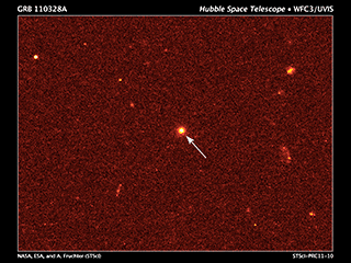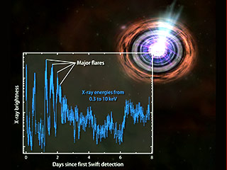 Астрономы обнаружили необычайно мощный взрыв звезды, попавшей в черную дыру. Обычно вспышки гамма-излучения, вызванные такими событиями, длятся всего по два часа. Но на этот раз колебания радиоактивности продолжаются уже более недели.