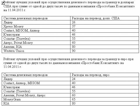 По данным компании Простобанк Консалтинг, средние расходы на проведение денежного перевода за границу в долларах США на сумму от 3,5 до 4 тысяч долларов на 11.04.2011 г. составляют 87 долларов. На 20.12.2010 г. средние расходы по переводу такой суммы составляли 95 долларов. Таким образом, затраты клиентов снизились на 8 долларов, или на 8,4%. Намного значительнее снизились средние расходы при переводе на сумму от 5 до 6 тысяч долларов. Такие услуги подешевели на 25 долларов или на треть – до 50 долларов США, пишет БизнесГид.