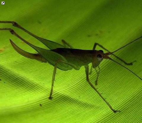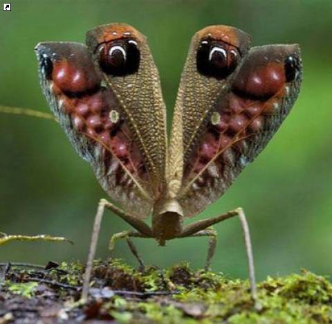 Это большое насекомое из тропических лесов горных районов Гайаны Акараи использует две эффективных стратегии, чтобы защитить себя: во-первых, оно выглядит как опавший лист, а во-вторых, если ему грозит опасность, оно поднимает пару крыльев с узором в виде глаз и начинает прыгать таким образом, чтобы его противник принял его за голову гигантской птицы.