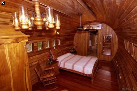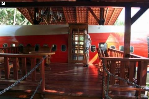 Что можно сделать со старым Boeing 727? Можно конечно отправить его на кладбище самолетов, а можно реконструировать и снова пустить в дело – не в небе, так на земле. Именно так и поступили создатели отеля – «Коста Верде», который находится недалеко от Куэпоса в Коста-Рике. Расположенный на утесе, выходящем на тропический лес у берега Тихого океана, этот отель может похвастаться уютными, отделанными деревом номерами с прекрасным видом на богатую костариканскую природу. Каркас самолета был перенесен по частям из аэропорта Сан-Хосе. Каждую часть осторожно перевозили на автопоезде в джунгли Мануэля Антонио. Сейчас самолет располагается на краю национального парка на 15-метровом пьедестале. На этой высоте можно наслаждаться отличными видами на океан и джунгли прямо с деревянной платформы, построенной на месте бывшего правого крыла самолета.