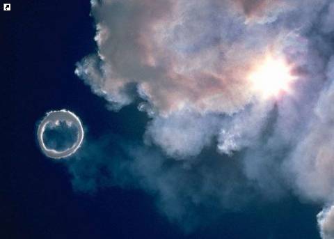 Исландский вулкан Эйяфьятлайокудль продолжает нас удивлять.Геолог Джозеф Ликшиарди Университета Нью-Гемпшира не смог поверить своим глазам, когда увидел два паровых кольца над кратером вулкана. Он успел выхватить фотоаппарат и запечатлеть, как Эйяфьятлайокудль выдувает дымовые кольца высоко в небо. Последний раз схожее чудо можно было наблюдать в 2000 году у вулкана Этна. Кольца Эйяфьятлайокудля плавали в небе около пяти минут и Джозеф Ликшиарди считает что ему невероятно повезло - зафиксировать данные кадры.