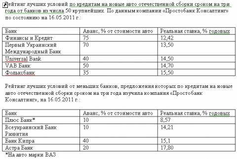 По данным компании Простобанк Консалтинг, количество банков из числа 50 крупнейших, предлагающих кредиты на покупку новых авто отечественной сборки, на 16.05.2011 г. составило 29 учреждений. С начала марта на этот рынок вышли банк «Credit Agricole», Universal Bank, VAB Банк, банк «Клиринговый дом» и Эрсте Банк, однако одно учреждение покинуло этот сегмент кредитования – банк «Кредит-Днепр», пишет БизнесГид.