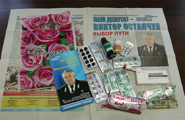 Работники изюмской больницы, которая находится в районе местного вокзала, разносили пакеты с медикаментами по домам и квартирам, в которых живут люди преклонного возраста. Как правило, медсестры больницы, передавая пакет с медикаментами пенсионерам, сообщали, что это подарок от кандидата в депутаты Виктора Остапчука.