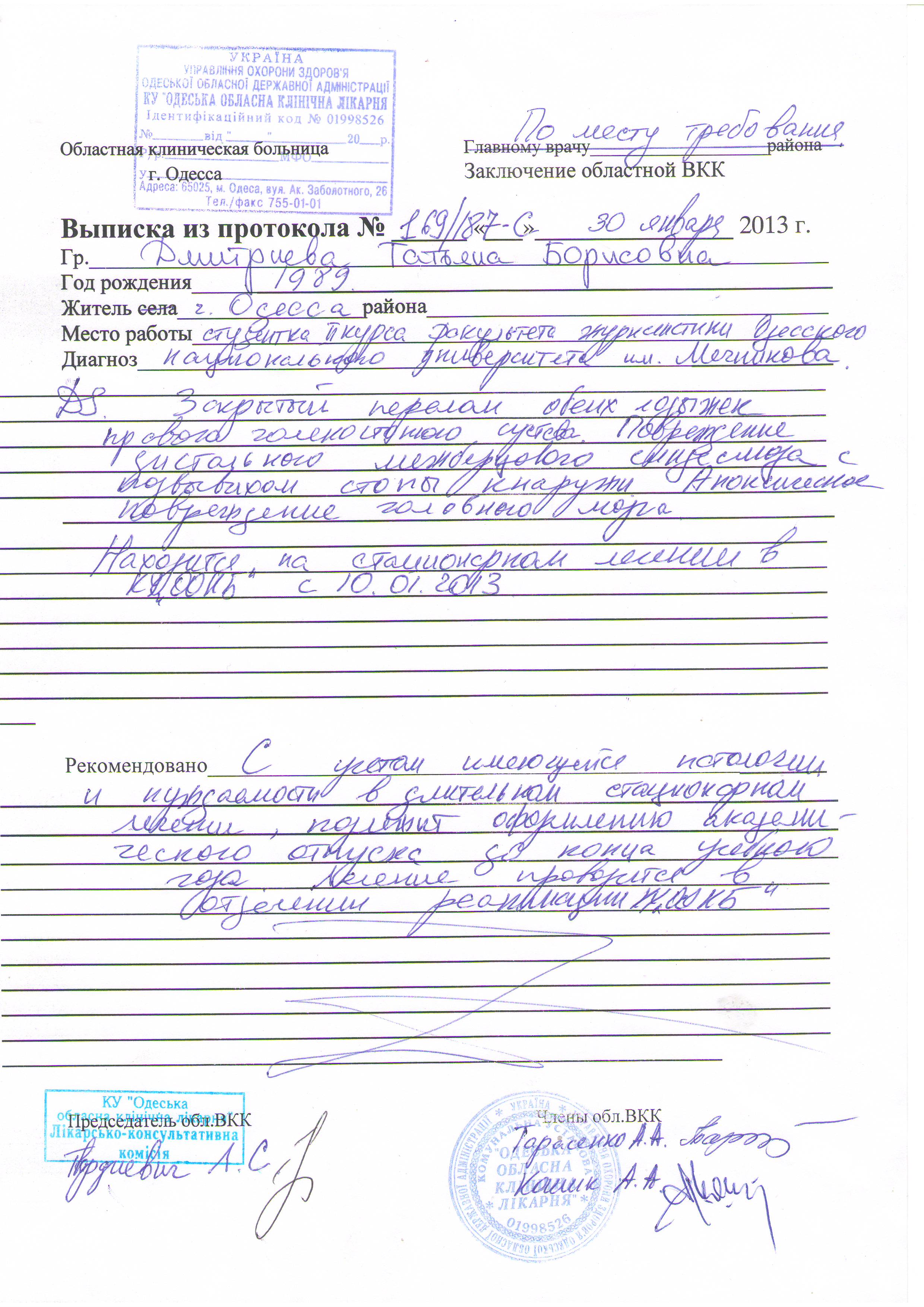 10 января в Одесскую областную клиническую больницу поступила Татьяна Дмитриева, 23 года, с переломом ноги. После рентгена была направлена на операцию. Девушке сделали спинальную анестезию, после этого у Тани произошла остановка сердца клиническая смерть, длилась 4 минуты.