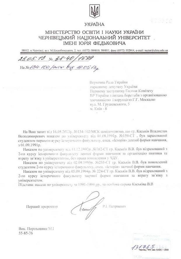Как пишет Москаль, документ свидетельствует, что Владислав Каськив, возглавляющий Госагентство по инвестициям и управлению нацпроектами, был исключен из вуза за пьянство и прогулы.